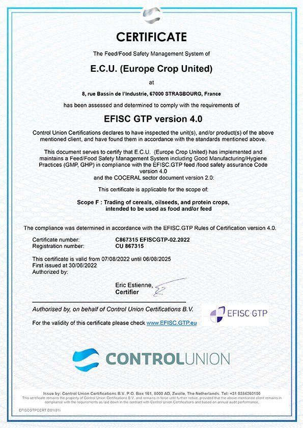 Europe Crop United (E.C.U.) commercialise toutes céréales et oléagineux, mais le maïs et le blé occupent une place prépondérante et représentent plus de 90 % du volume. E.C.U. a une double fonction celle de vendre la collecte de ses maisons mères, mais également de développer une activité de trading. Nous pouvons nous appuyer sur les infrastructures de nos maisons mères, à savoir 14 silos portuaires sur le Rhin de Huningue à Ludwigshafen, ce qui nous permet d’optimiser nos livraisons tout au long de l’année. Nous sommes une équipe franco-allemande de 5 personnes ayant une longue expérience dans le commerce et l’exécution des grains.